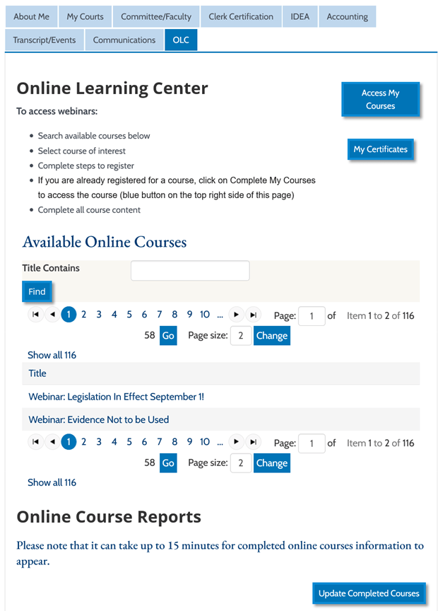 If you are certain you completed one or more webinar that is not reflected on your transcript and are certain you completed the evaluation and record of attendance, then clicking on the Update Completed Courses button while on the OLC tab will update your transcript. See the button in the bottom right corner of the screen grab below: