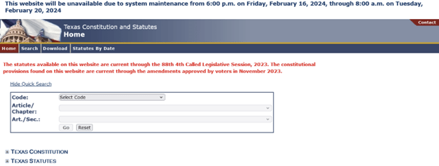 The state maintains a wonderful website where every Texas statute is available at the click of a button. Users should be aware that the website will go down for maintenance at 6:00 pm Friday, February 16, 2024 and will be down all weekend until 8:00 am on Tuesday, February 20, 2024.