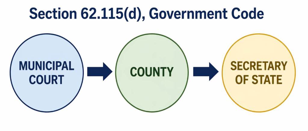 But this begs an important question: where or to whom in the county should municipal courts send this report? The Government Code does not tell us. And to complicate matters further, municipal court clerks from various counties all report doing it differently. One municipal court sends the list to the County Clerk while another court stated that the County Clerk will not accept it so they send it to the Voter Registrar. Yet another court reports that their practice is to send it to the District Clerk.