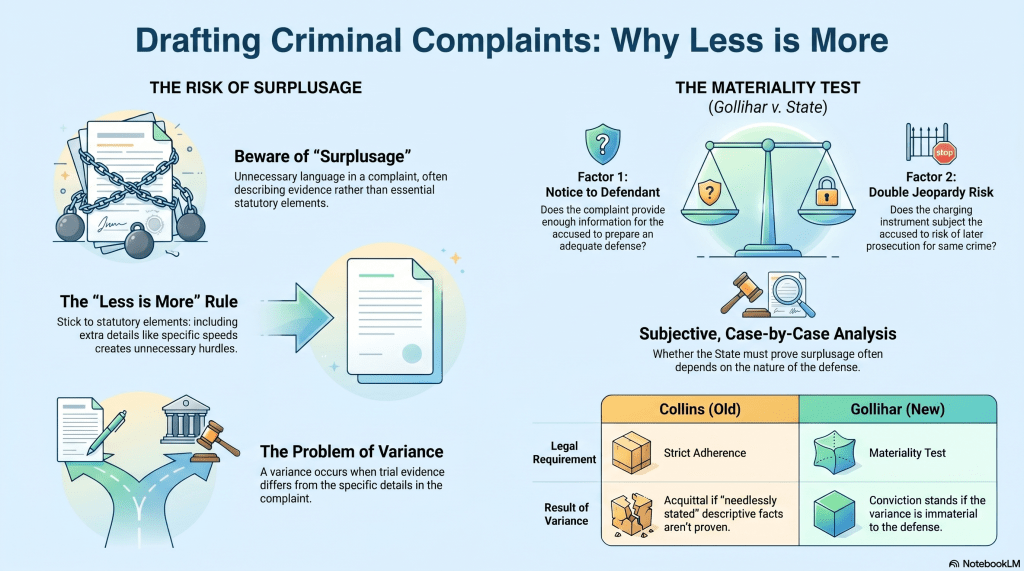 When looking at our earlier hypothetical, must the State prove the exact speed that the defendant was driving as listed in the complaint? Because of the Gollihar test’s subjective, case-by-case nature, it depends. The answer would likely hinge on the specific nature of the accused’s defense. If the defendant had prepared his defense by seeking to rebut the exact speed alleged in the complaint, the State would likely need to prove the exact speed alleged under Gollihar. But if the defendant argues that he was not even driving a car that day, the State might not need to prove the exact speed alleged. Fortunately, well-drafted complaints that do not include unnecessary information are not subject to the Gollihar test.