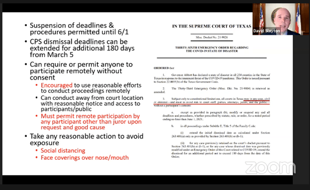 RC: From a purely selfish standpoint, I thought the timing was unfortunate since we had just wrapped the North Texas Virtual Regional. Many of our talking points in the Keynote became moot with the changes literally one day after we discussed them. I think one of the biggest was the directive in the 33rd Emergency Order that courts “must continue to use all reasonable efforts to conduct proceedings remotely.” (emphasis added). We spent a lot of time discussing this provision, as it was reflected not only in the emergency orders, but also the official guidance from OCA and in a memo released by the Conference of Regional Judges in July 2020. The 36th Emergency Order makes a small, but incredibly important change to that sentence. It now reads, “courts should continue to use all reasonable efforts.” (emphasis added). That is a pretty big change. As any lawyer knows, words matter! That said, the basic provisions from the 1st Emergency Order, though, largely do seem to have been renewed.